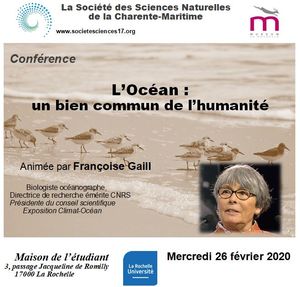 Pour compéter l’exposition, conférence à 17h de Françoise Gaill, biologiste océanographe, chercheuse CNRS sur le thème « L’océan : un bien commun de l’humanité ». Conférence en partenariat avec la Société des Sciences naturelles 17.